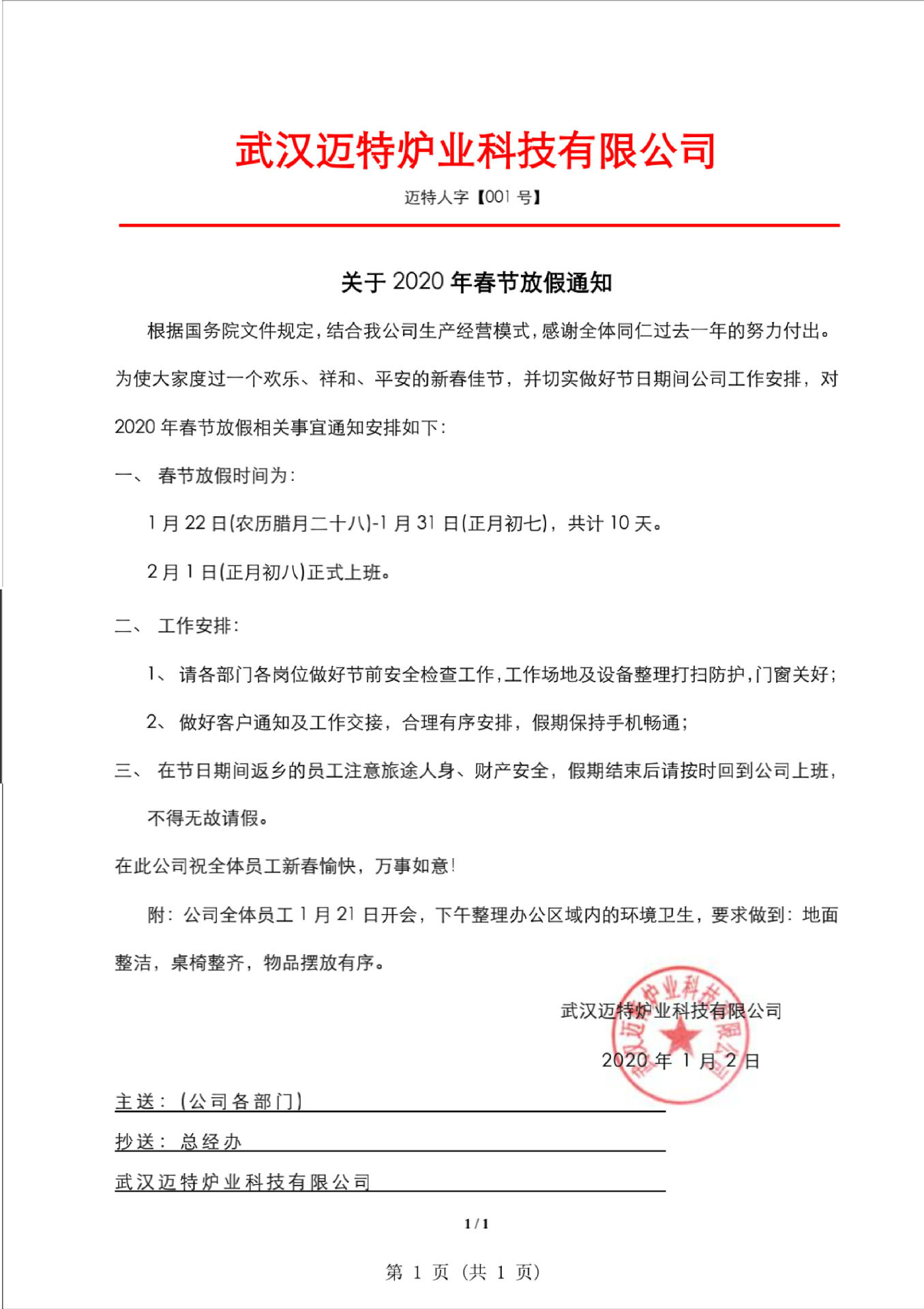 武漢邁特爐業(yè)科技有限關(guān)于2020年春節(jié)放假通知